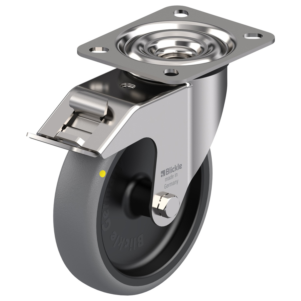 125mm stainless steel swivel/brake castor with grey electrically conductive thermoplastic rubber on polypropylene centre wheel