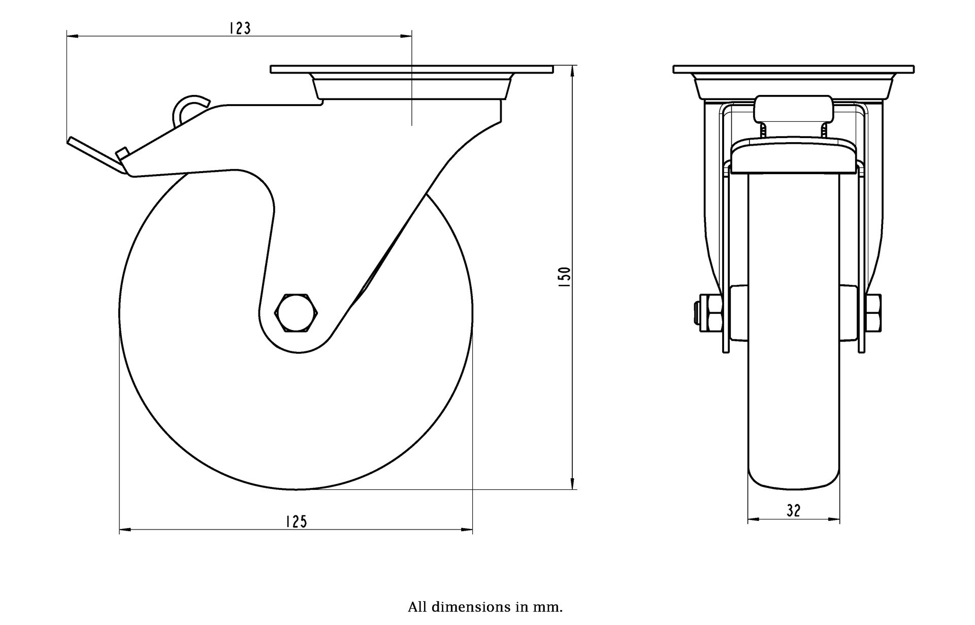 Foot operated brake that locks both swivel and wheel simultaneously.