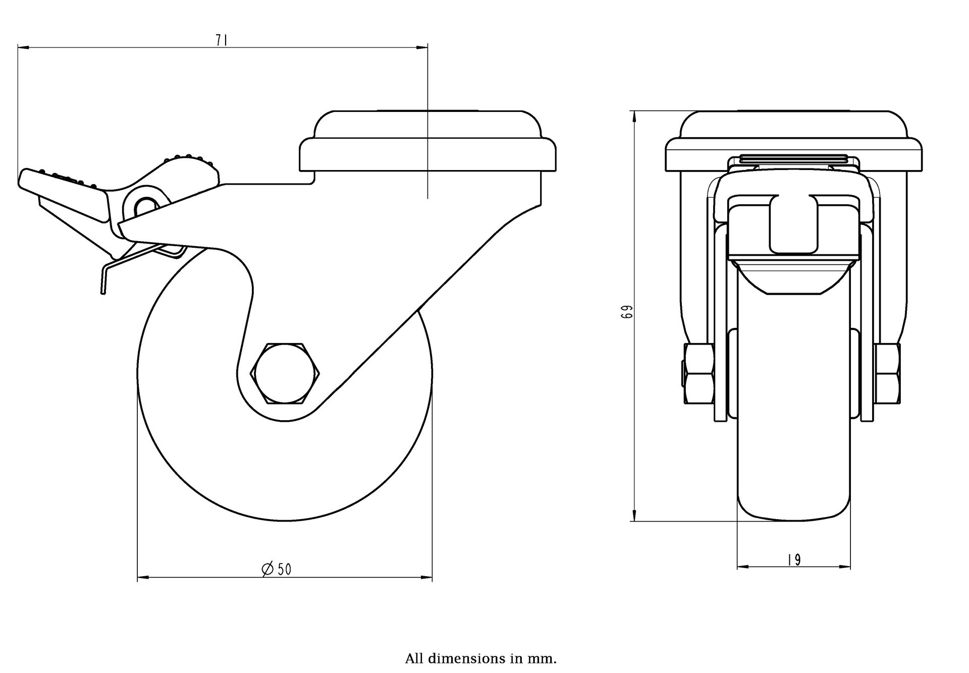 - Foot operated brake that locks both swivel and wheel simultaneously.