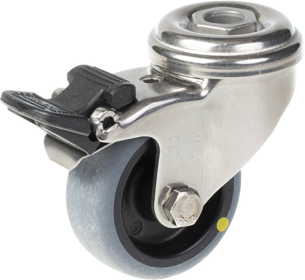 - Swivel/brake castor with bolt hole bracket made of stainless steel with double row ball race in swivel head (material no. 1.4301/AISI 304).