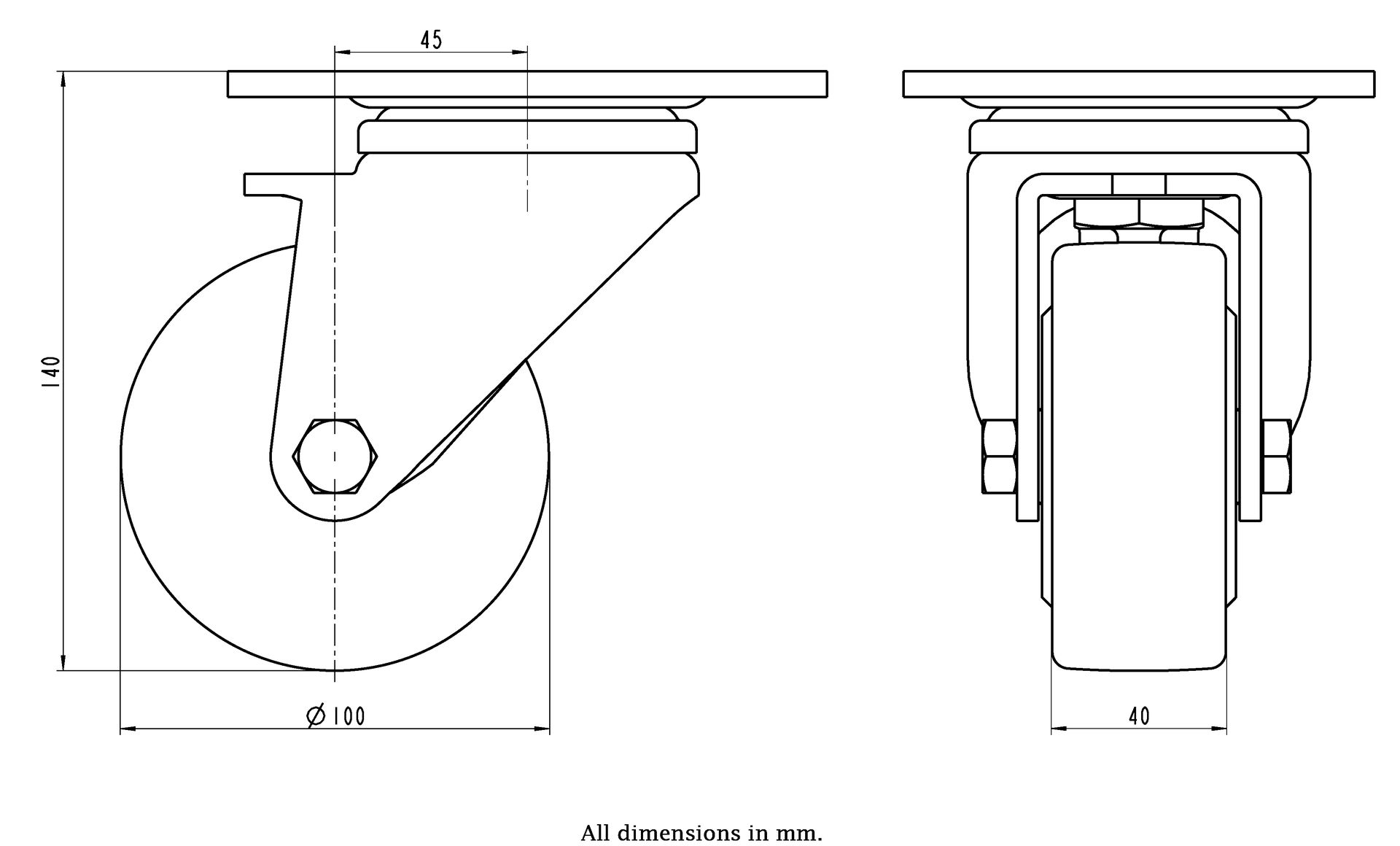 Swivel castor with strong top plate bracket made of zinc plated steel with hardened double row ball race in swivel head.
