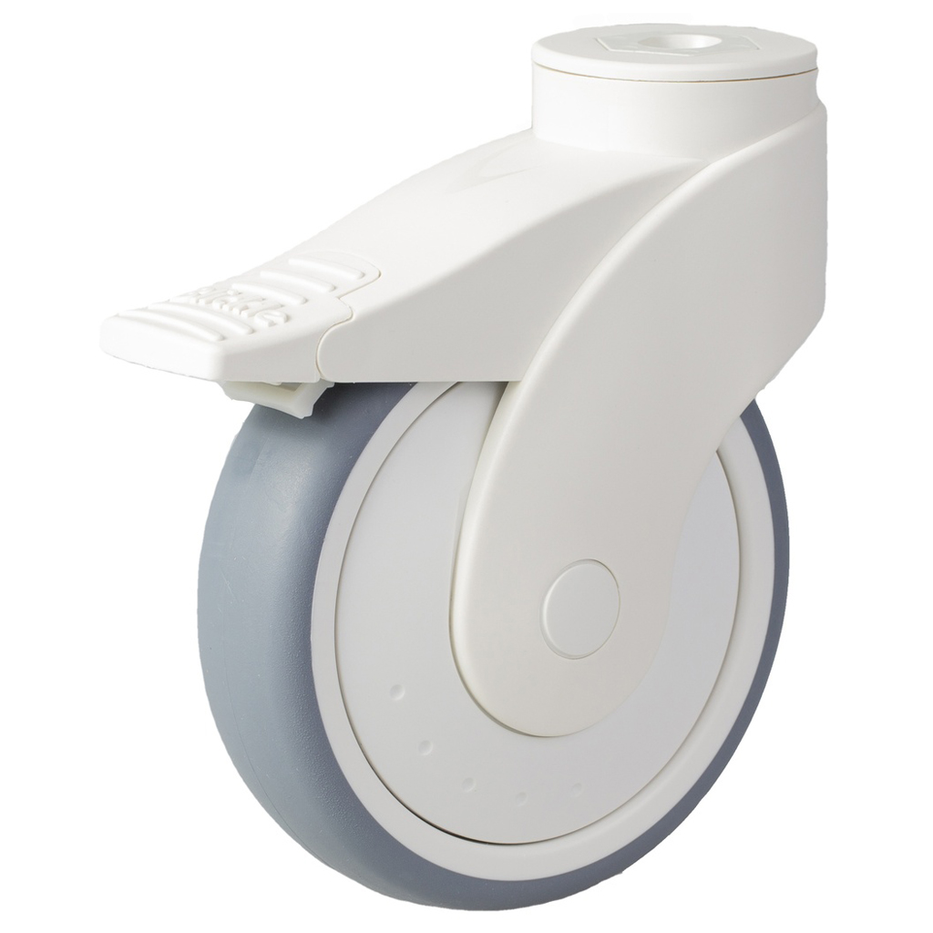 125mm plastic swivel/brake castor with grey thermoplastic rubber on polypropylene centre wheel