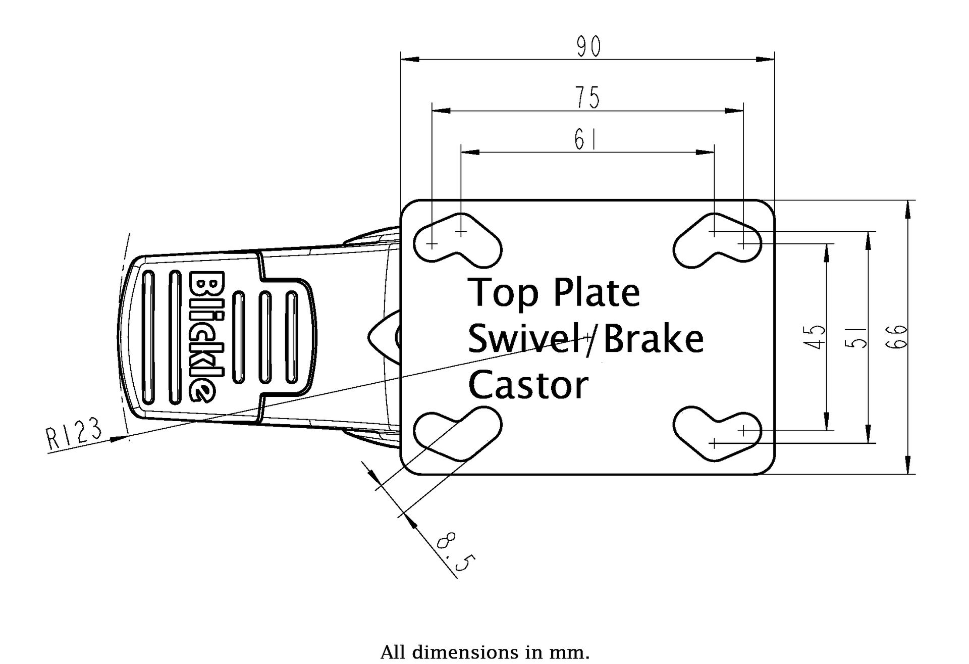 125mm plastic swivel/brake castor with grey thermoplastic rubber on polypropylene centre wheel