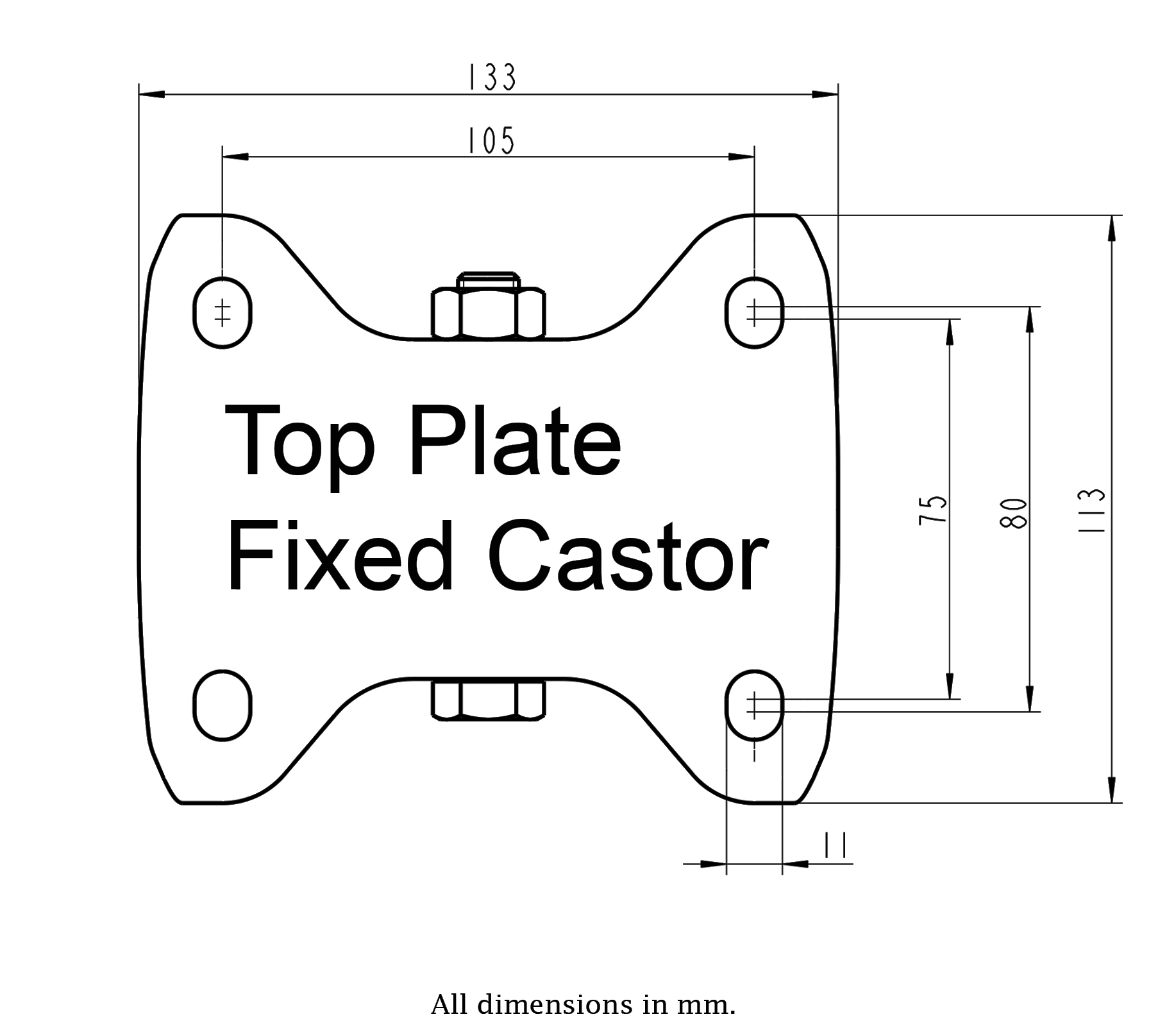 - Fixed castor with heat resistant top plate bracket made of zinc plated steel.