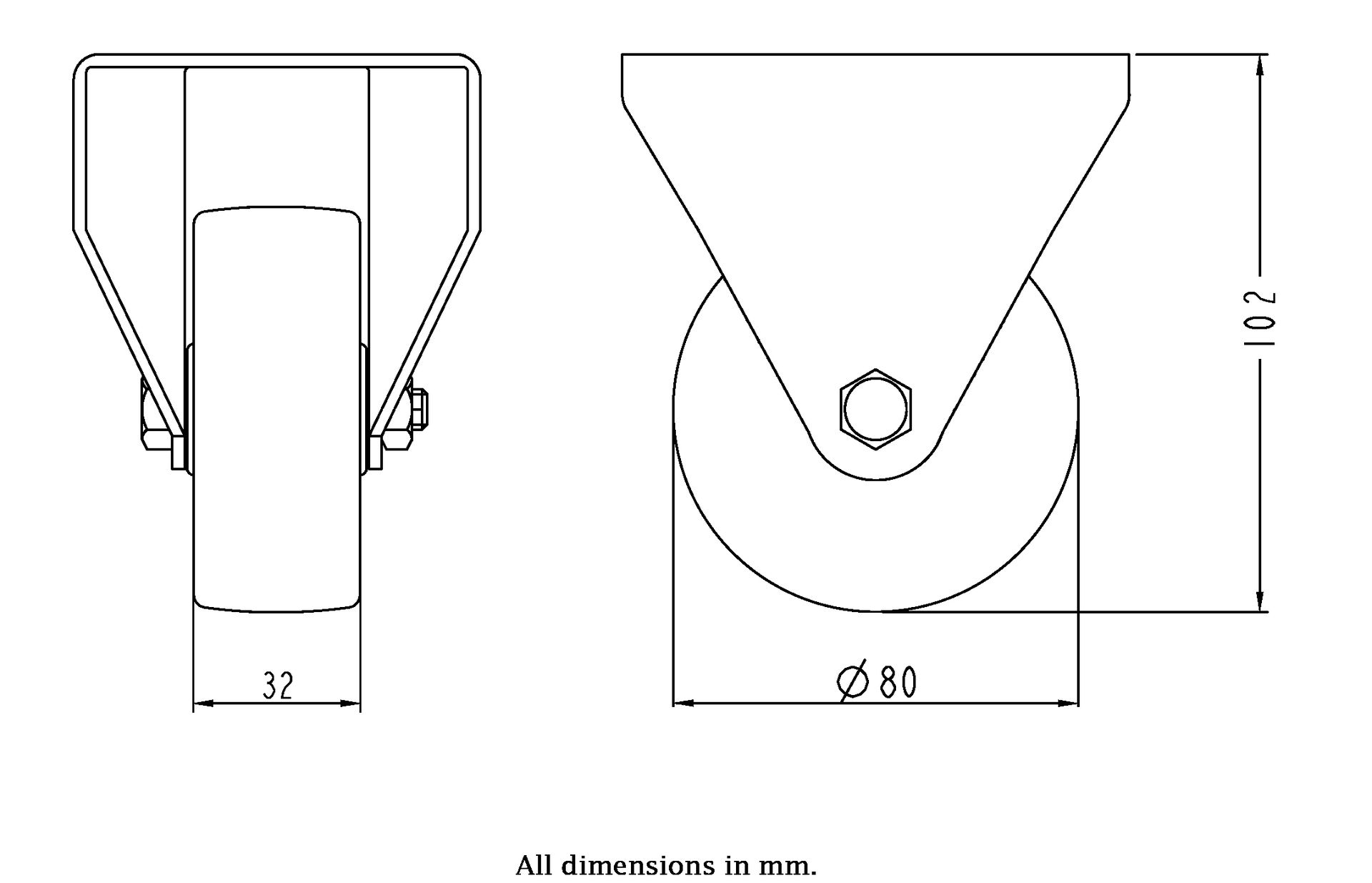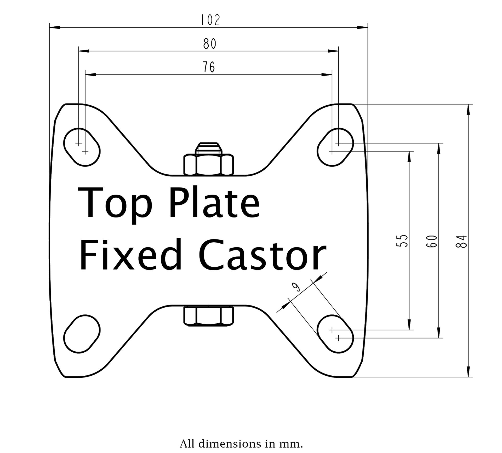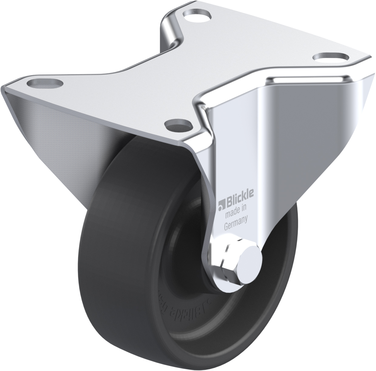 - Fixed castor with heat resistant top plate bracket made of zinc plated steel.