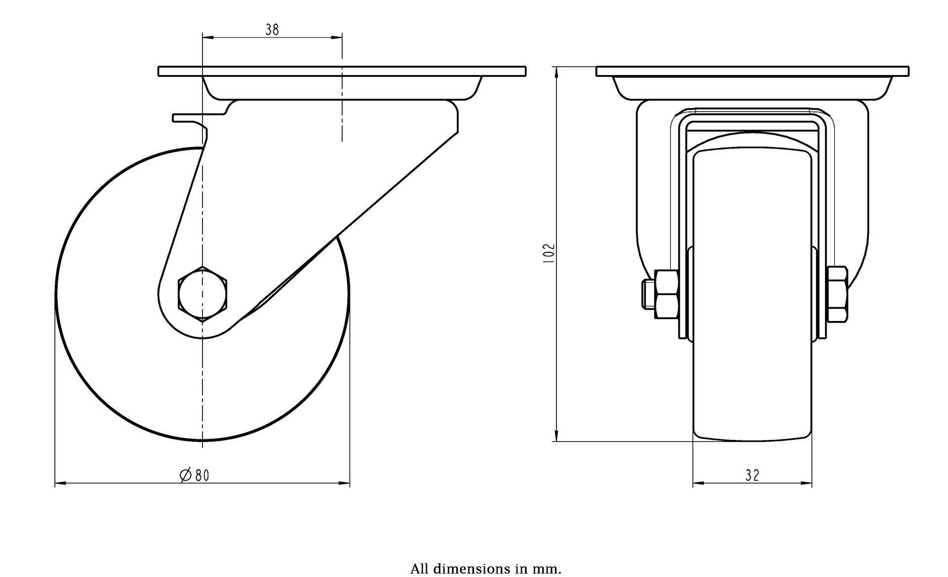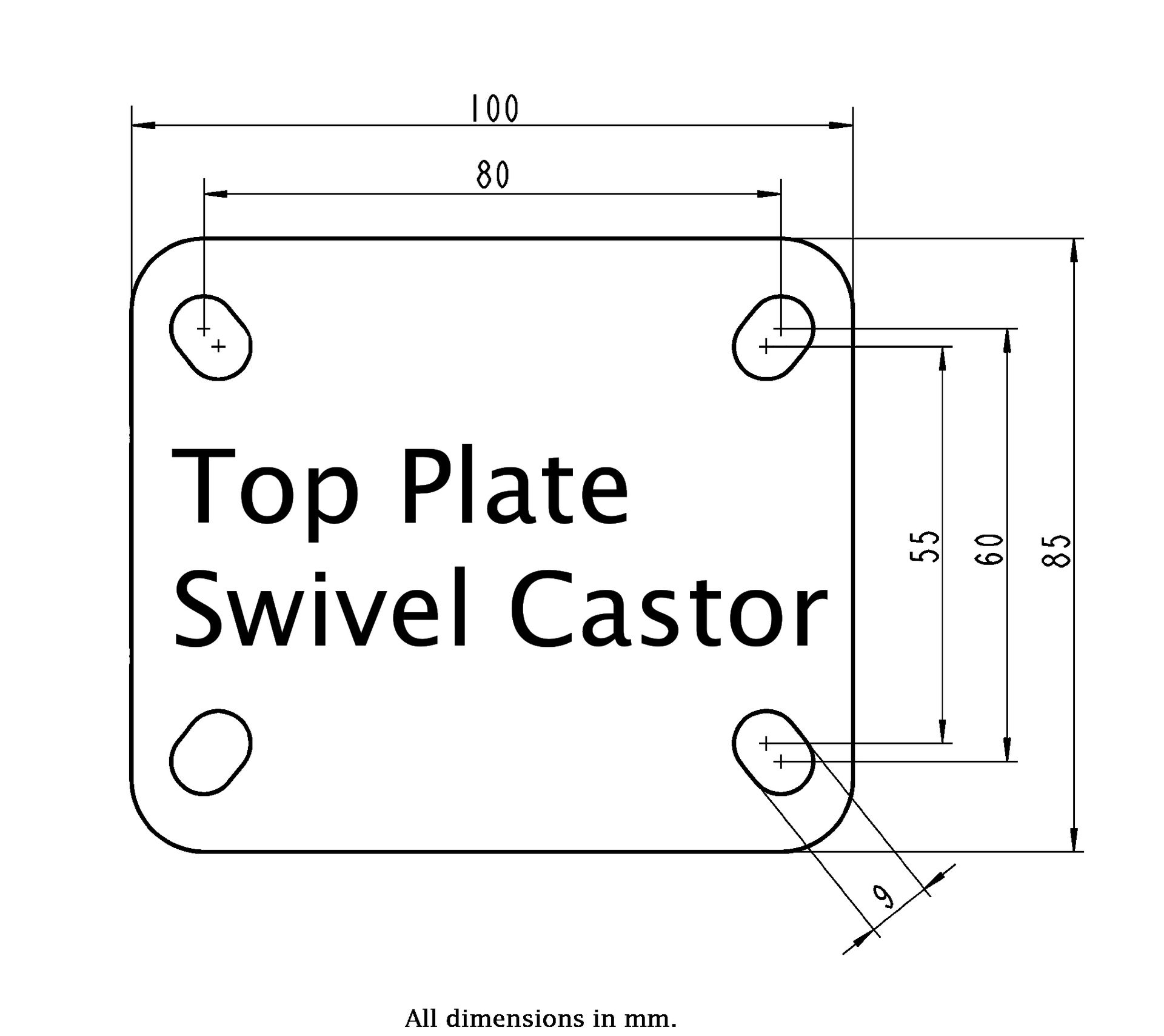 - Swivel castor with heat resistant top plate bracket made of zinc plated steel with double row ball race in swivel head.