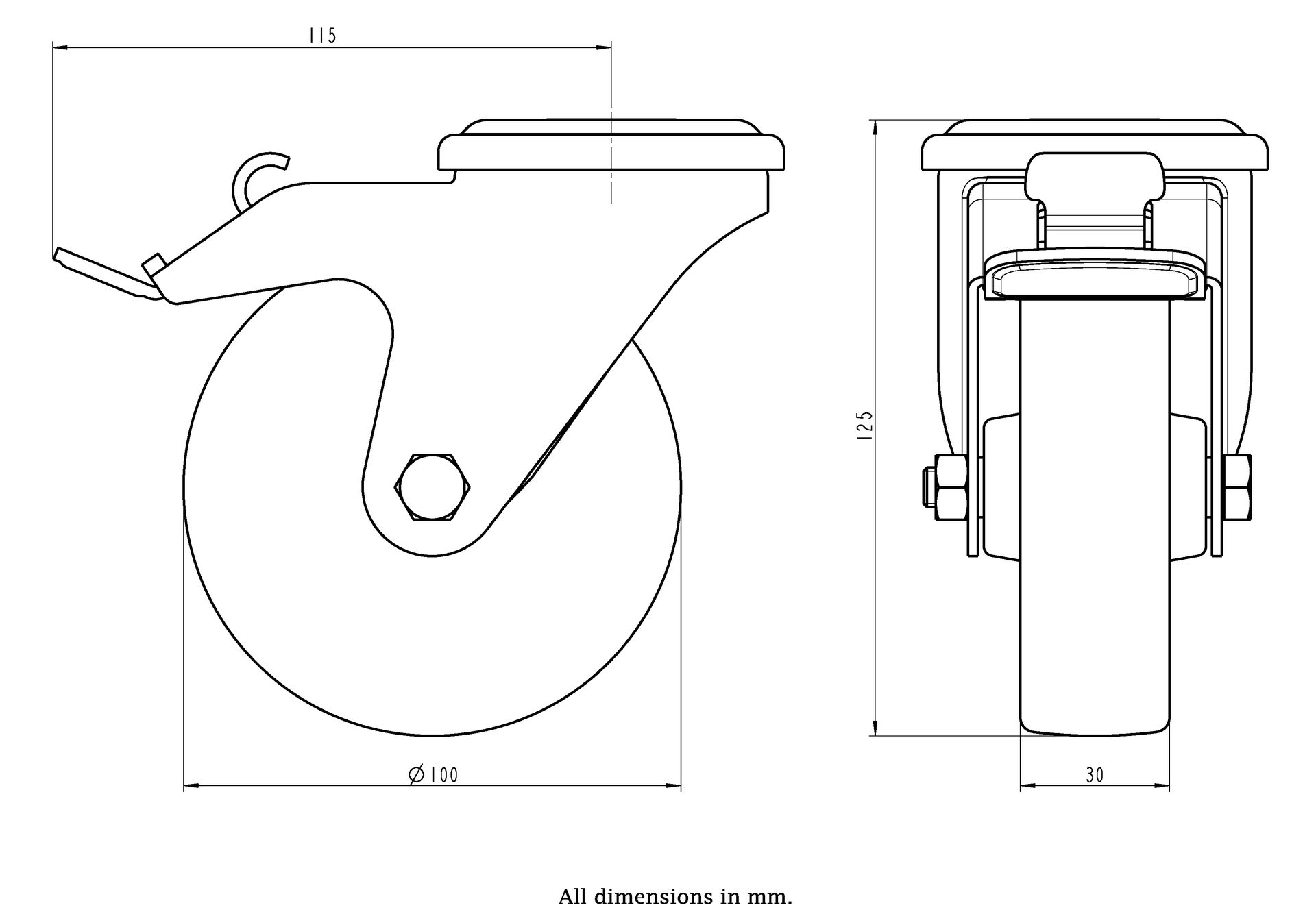 100mm heat resistant swivel/brake castor with thermoplastic wheel