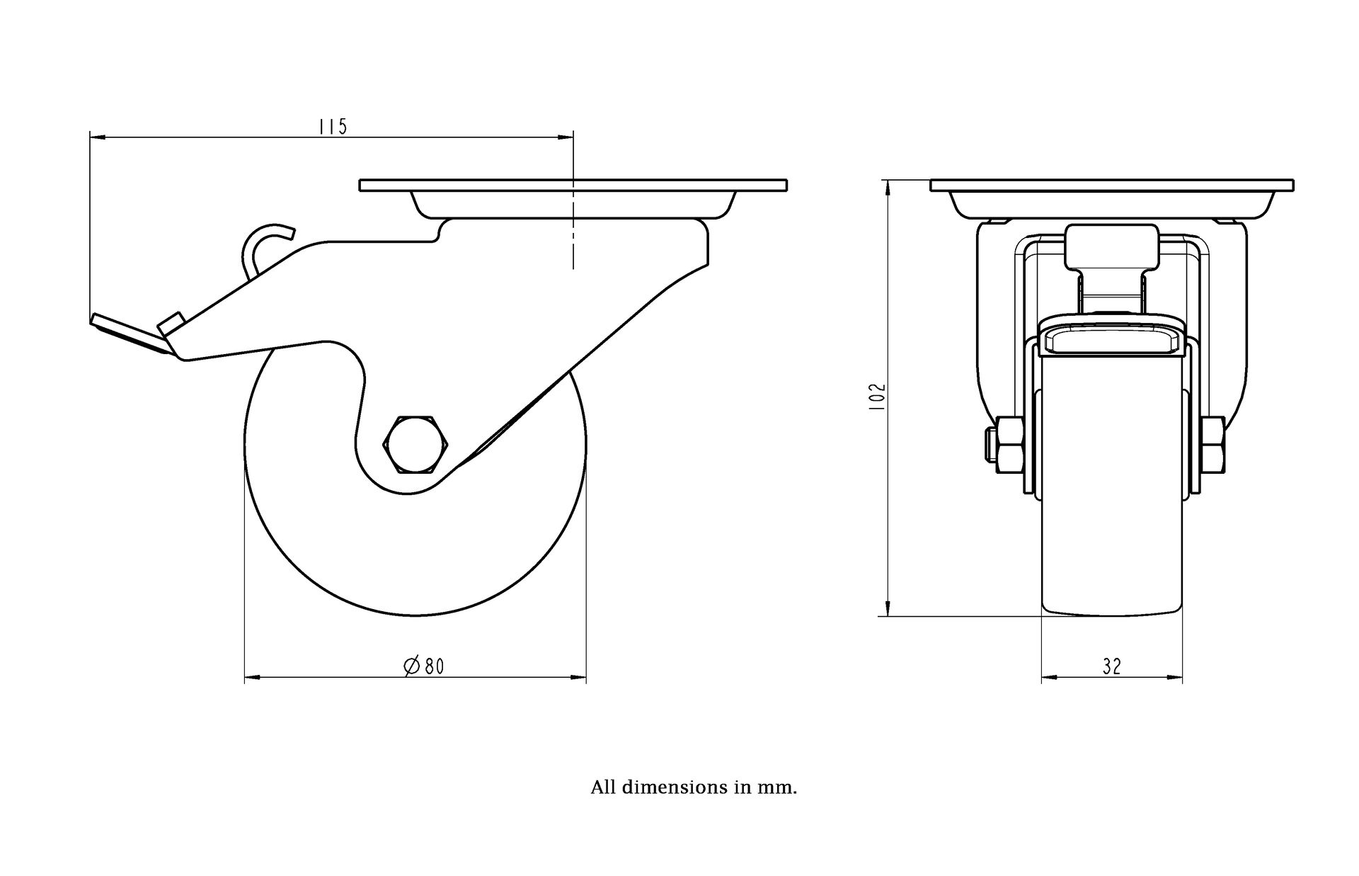 - Foot operated brake that locks both swivel and wheel simultaneously.
