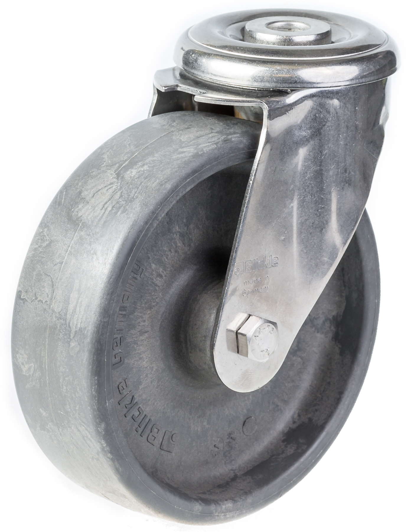 - Swivel castor with heat resistant bolt hole bracket made of stainless steel with double row ball race in swivel head (material no. 1.4301/AISI 304).