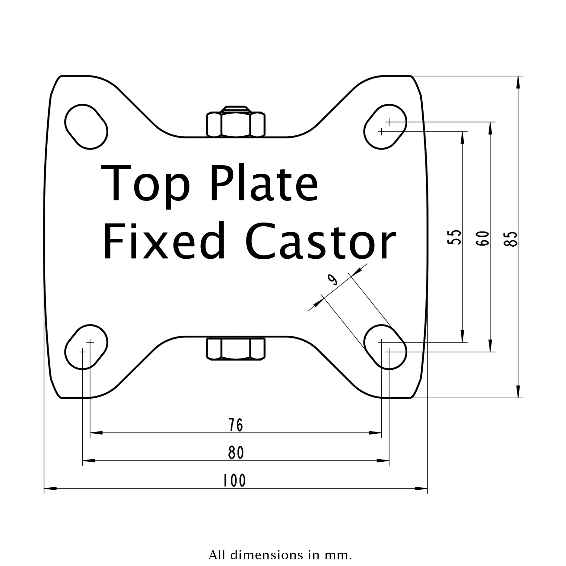- Fixed castor with heat resistant top plate bracket made of zinc plated steel.