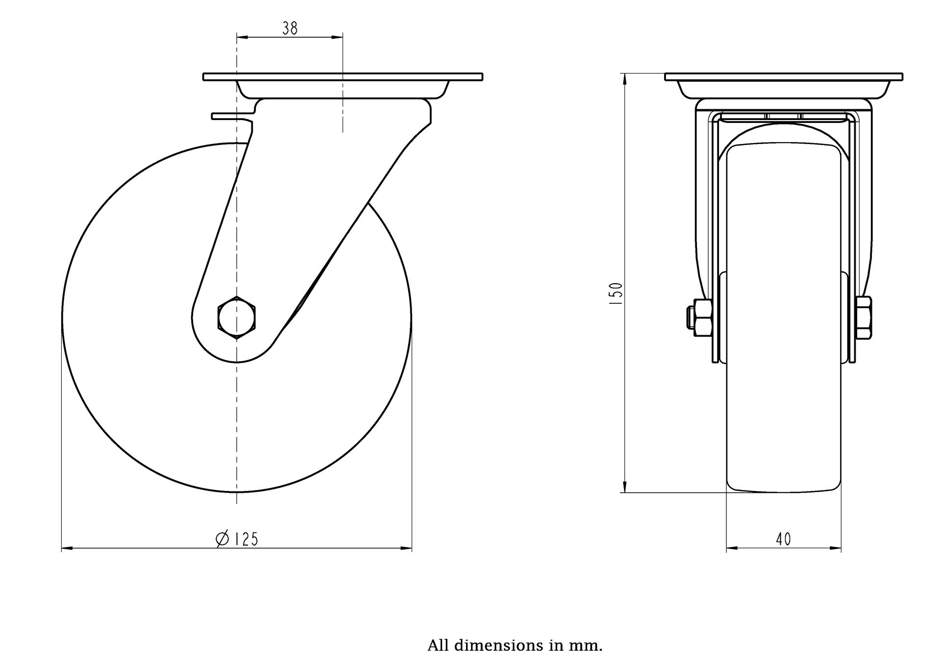 - Swivel castor with heat resistant top plate bracket made of zinc plated steel with double row ball race in swivel head.