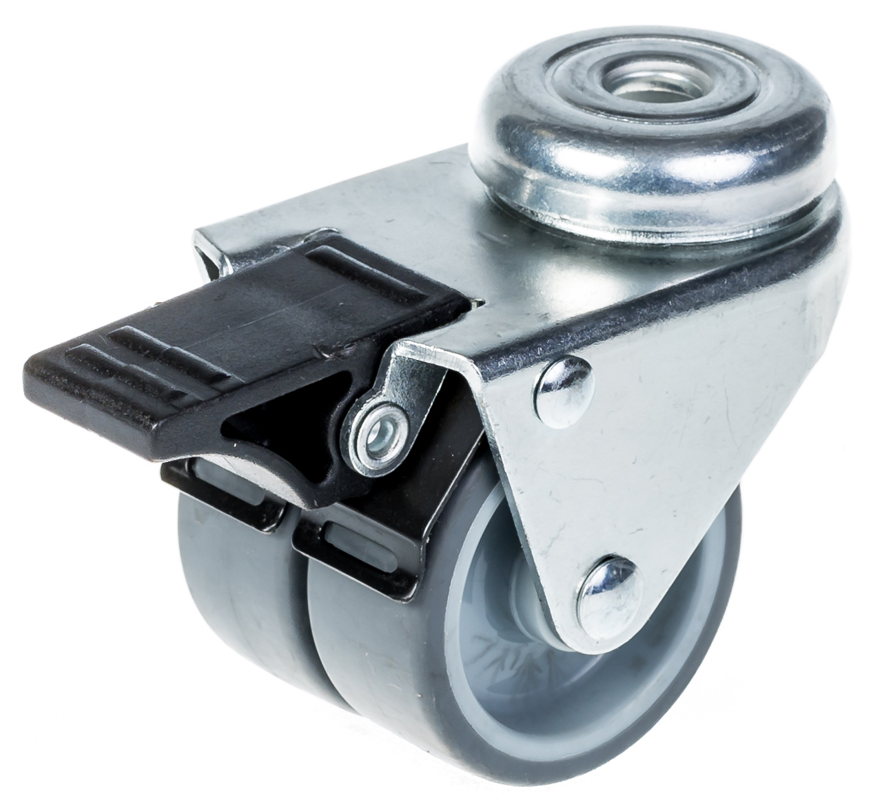 - Swivel/brake castor with bolt hole bracket made of zinc plated steel with double row ball race in swivel head.