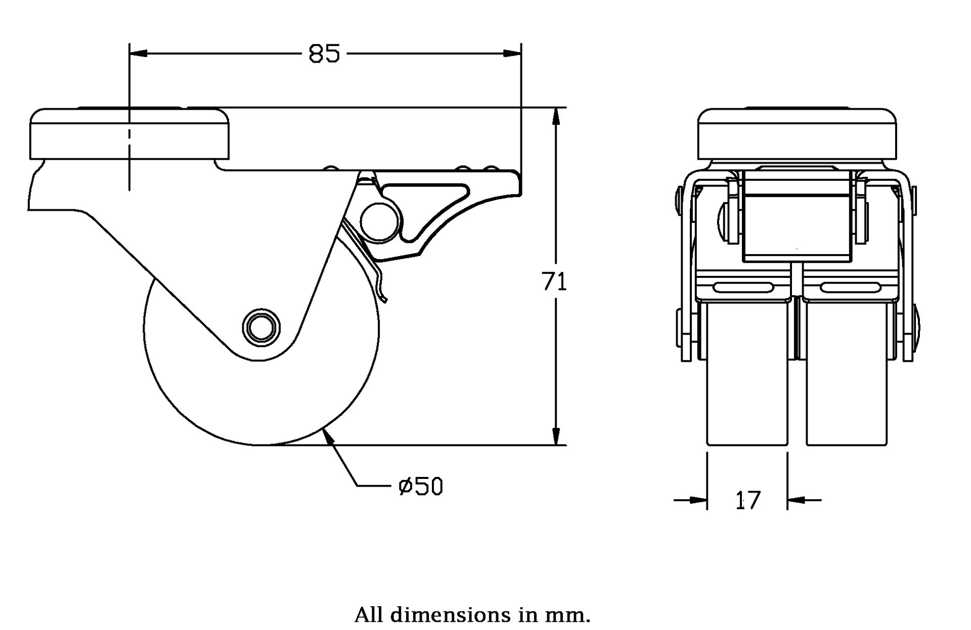 Swivel/brake castor with bolt hole bracket made of zinc plated steel with double row ball race in swivel head.