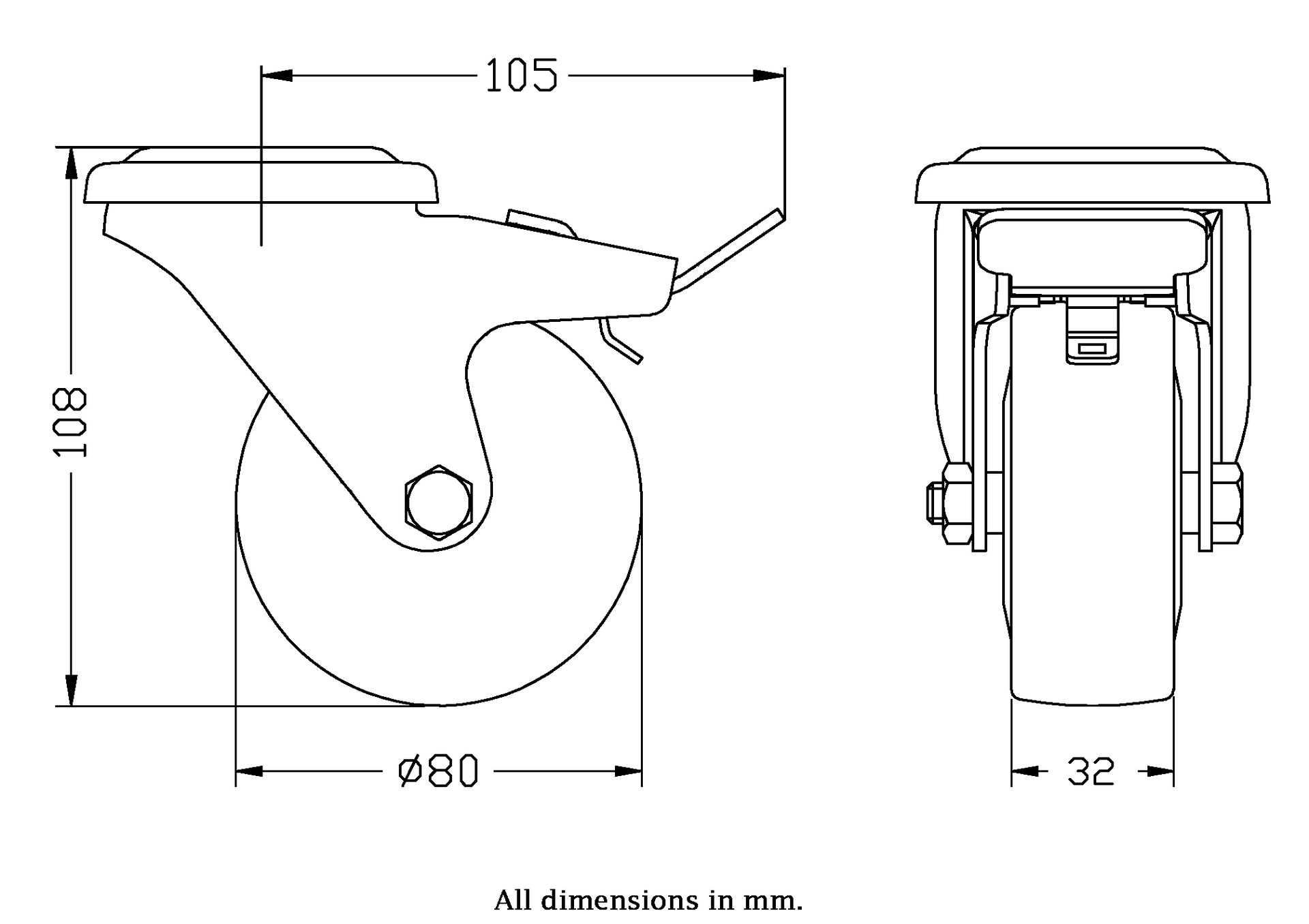 - Swivel/brake castor with bolt hole bracket made of zinc plated steel with double row ball race in swivel head.