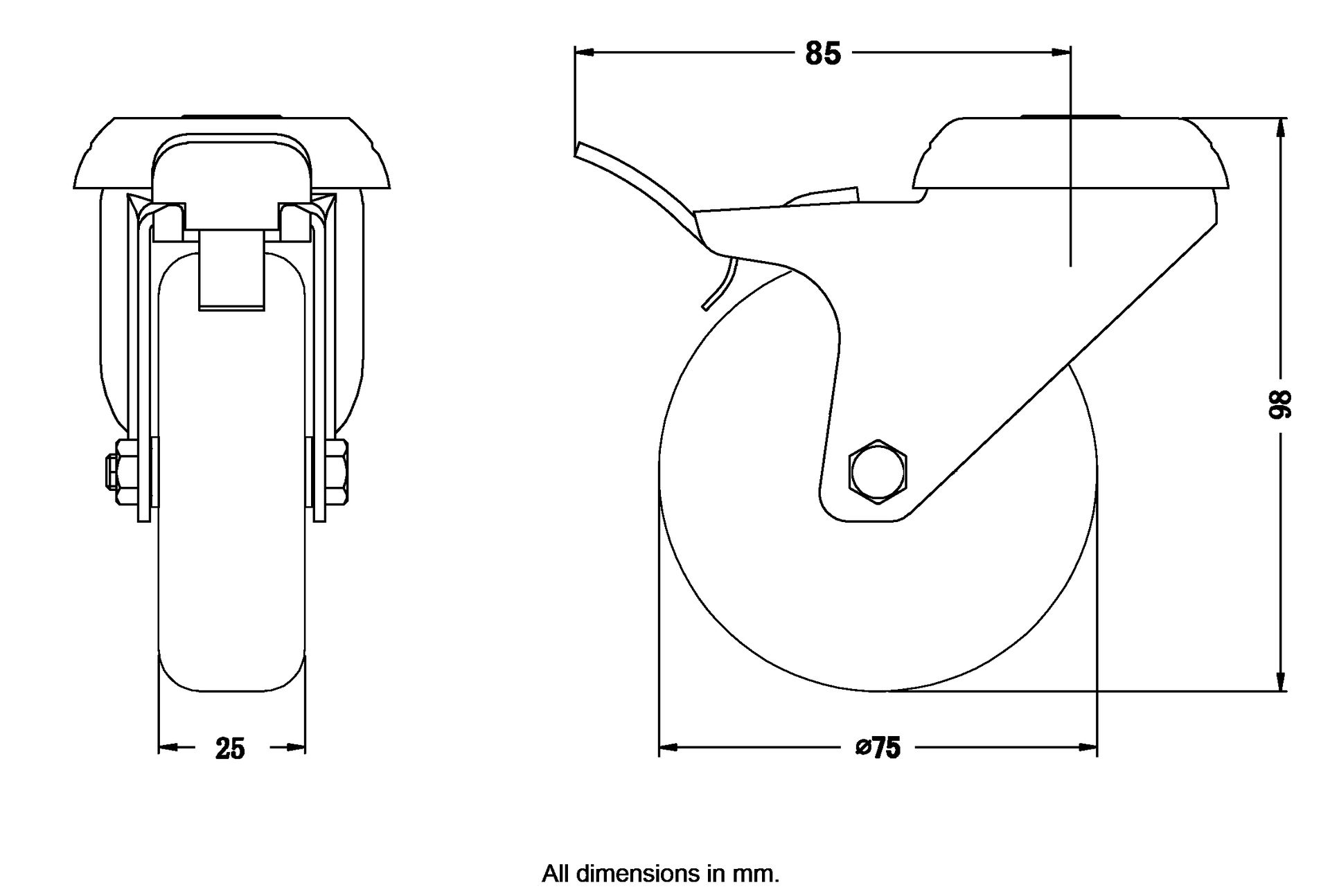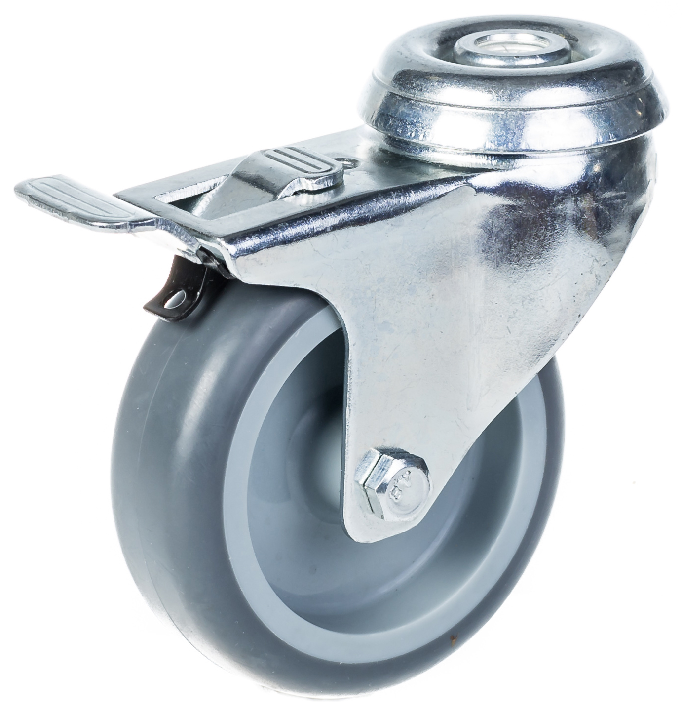 - Swivel/brake castor with bolt hole bracket made of zinc plated steel with double row ball race in swivel head.
