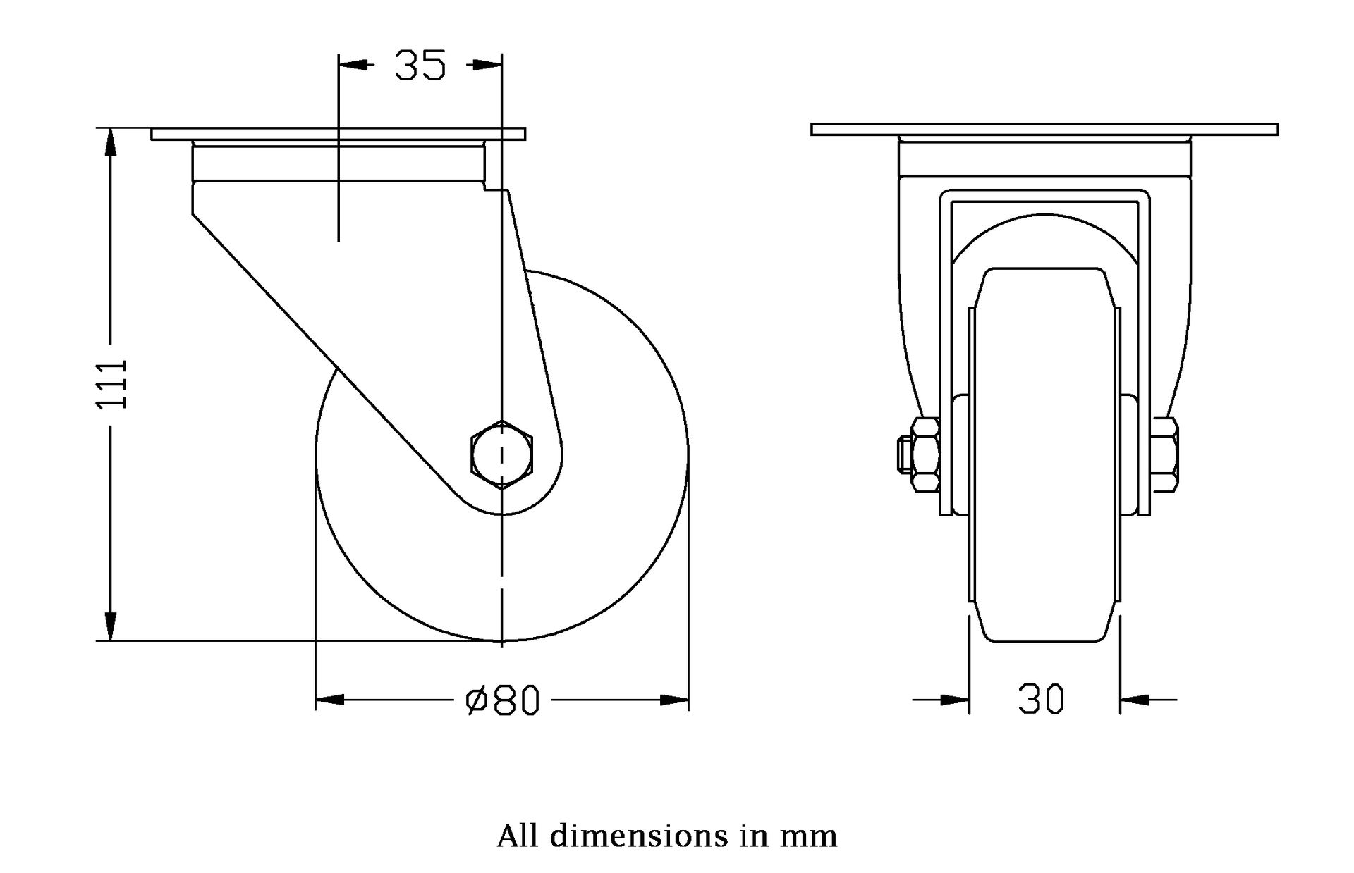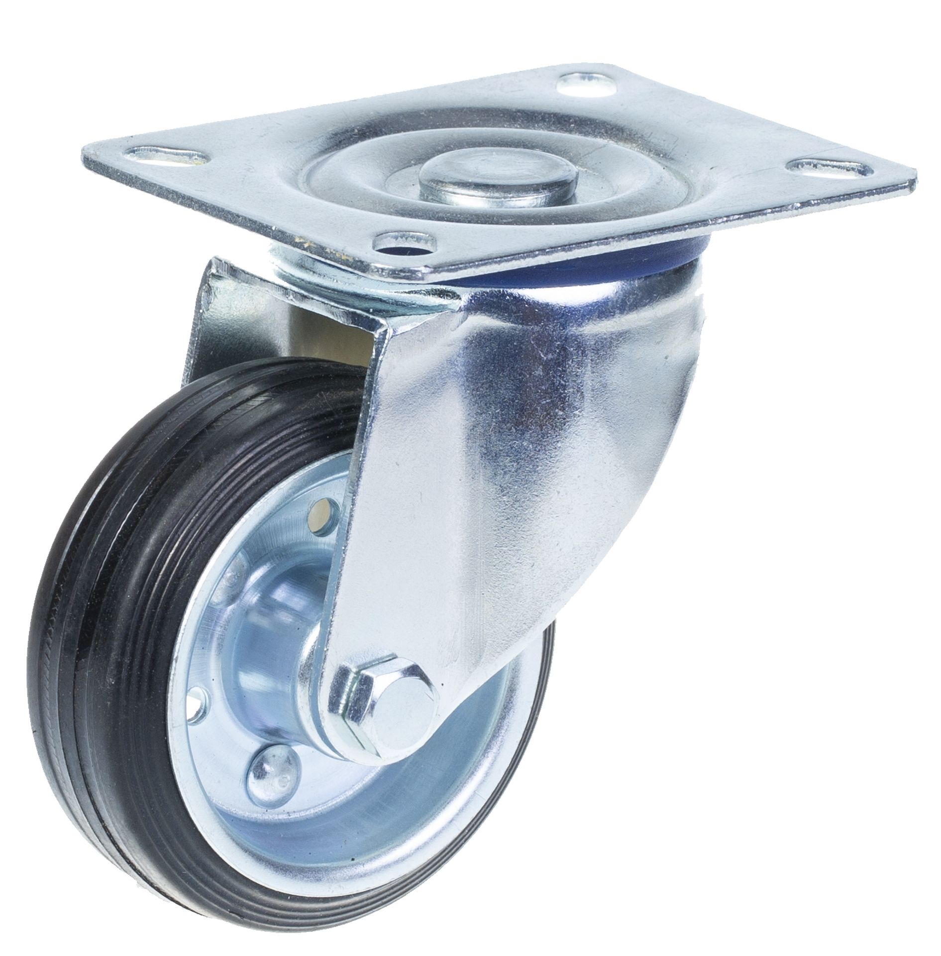 80mm swivel castor with black rubber on pressed steel centre wheel