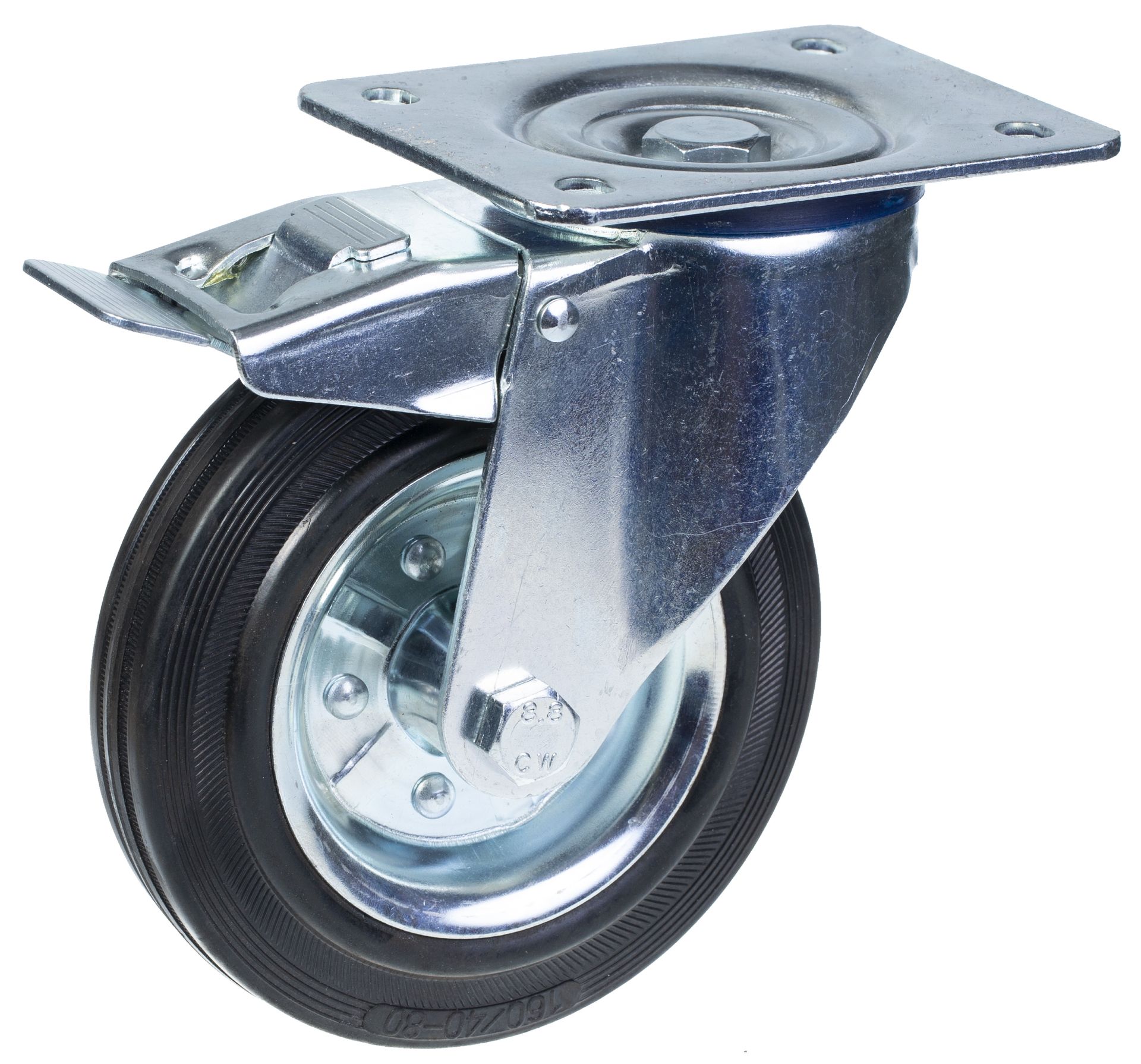 160mm swivel/brake castor with black rubber on pressed steel centre wheel