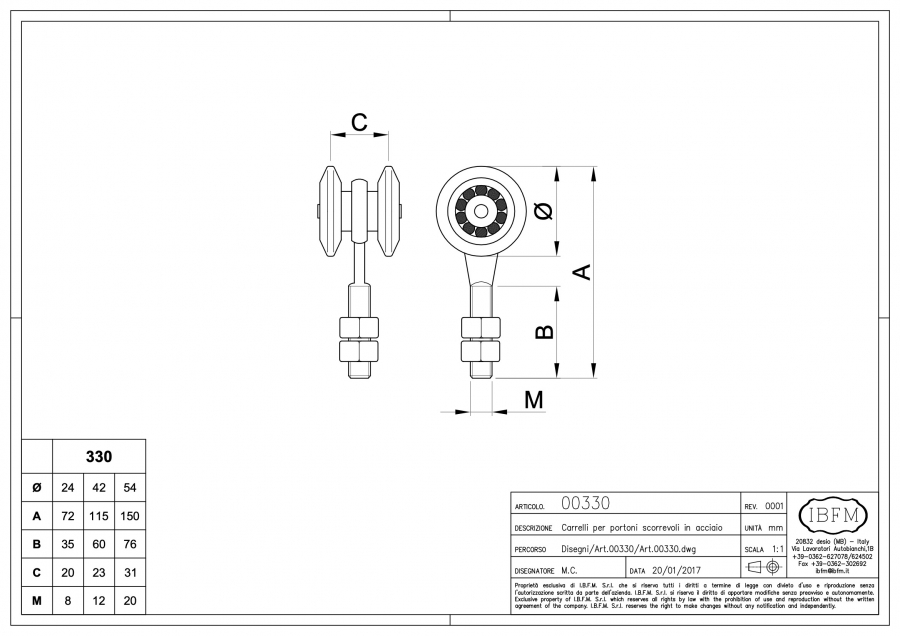 2-wheel Carriage for Hanging Gates - 2 Ball Bearings Zinc plated steel
