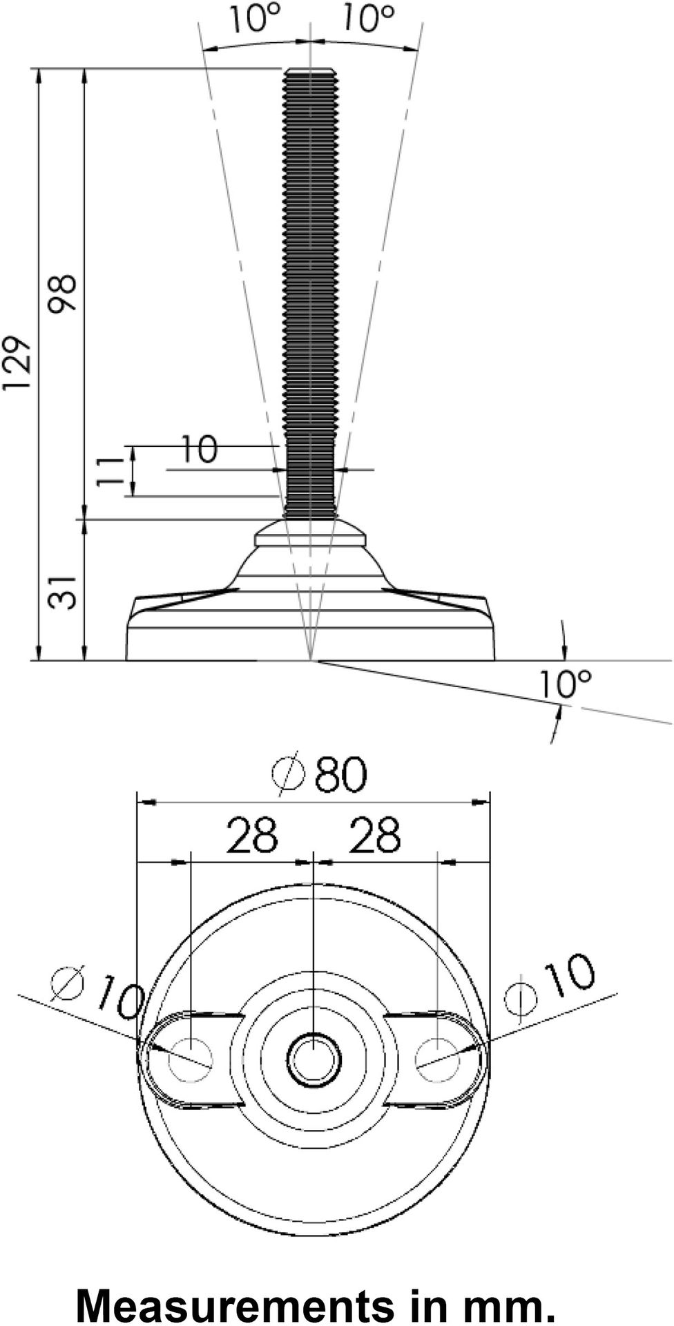 - Fully threaded levelling foot made of stainless steel thread (material no. AISI304/A2) and plastic base.