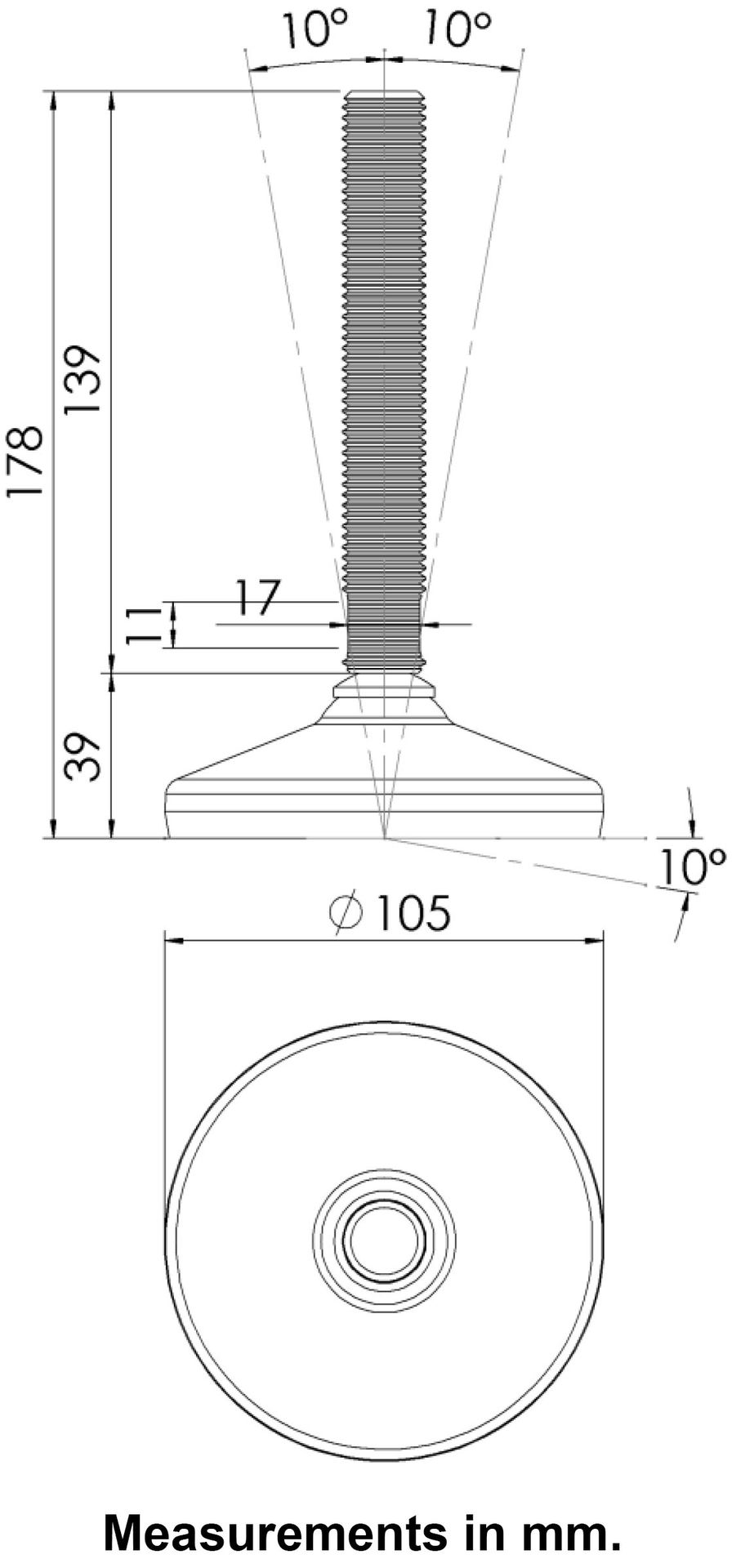 - Fully threaded levelling foot made of stainless steel (material no. 1.4301, AISI304/A2).
